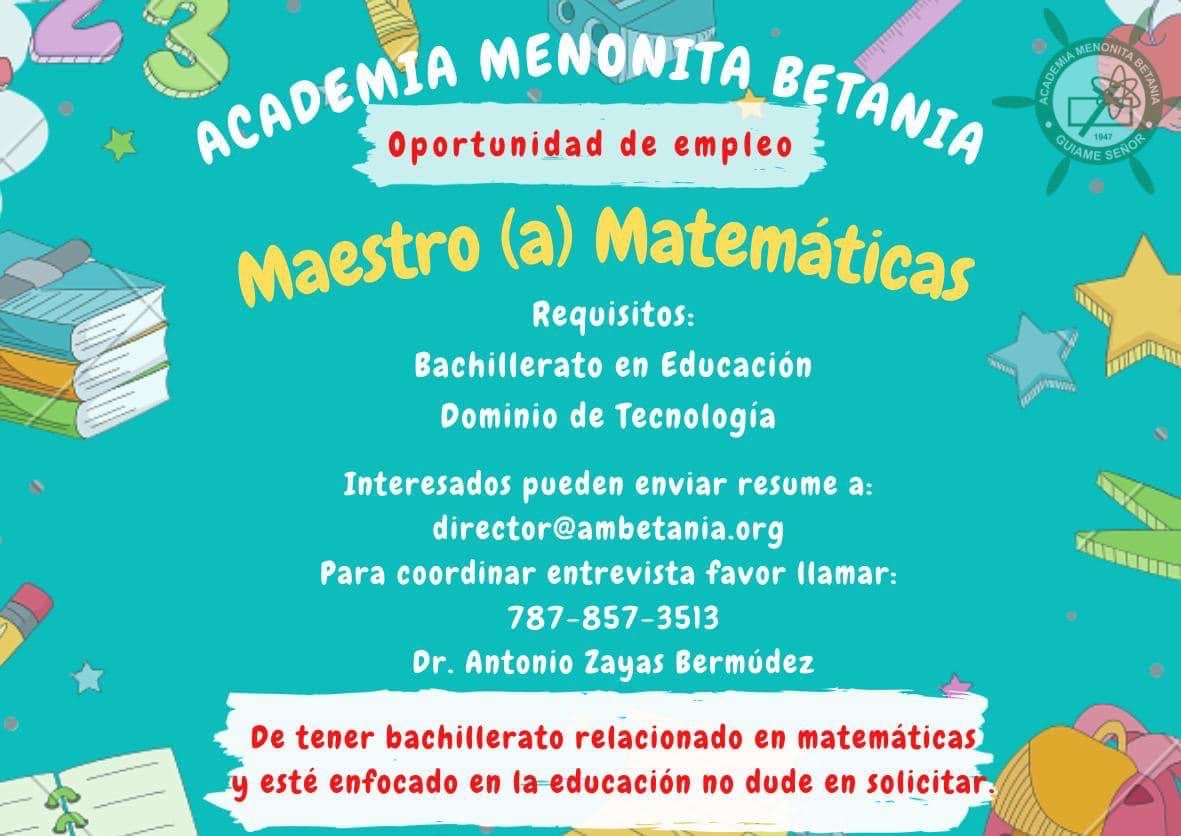Inicia el 2022 con una gran oportunidad de crecimiento profesional como Maestr@ de Matemáticas Secundaria Interesados pueden enviar resumé a: administracion@ambetania.org Para coordinar entrevista favor llamar: 787-857-3513 con el Dr. Antonio Zayas Bermúdez