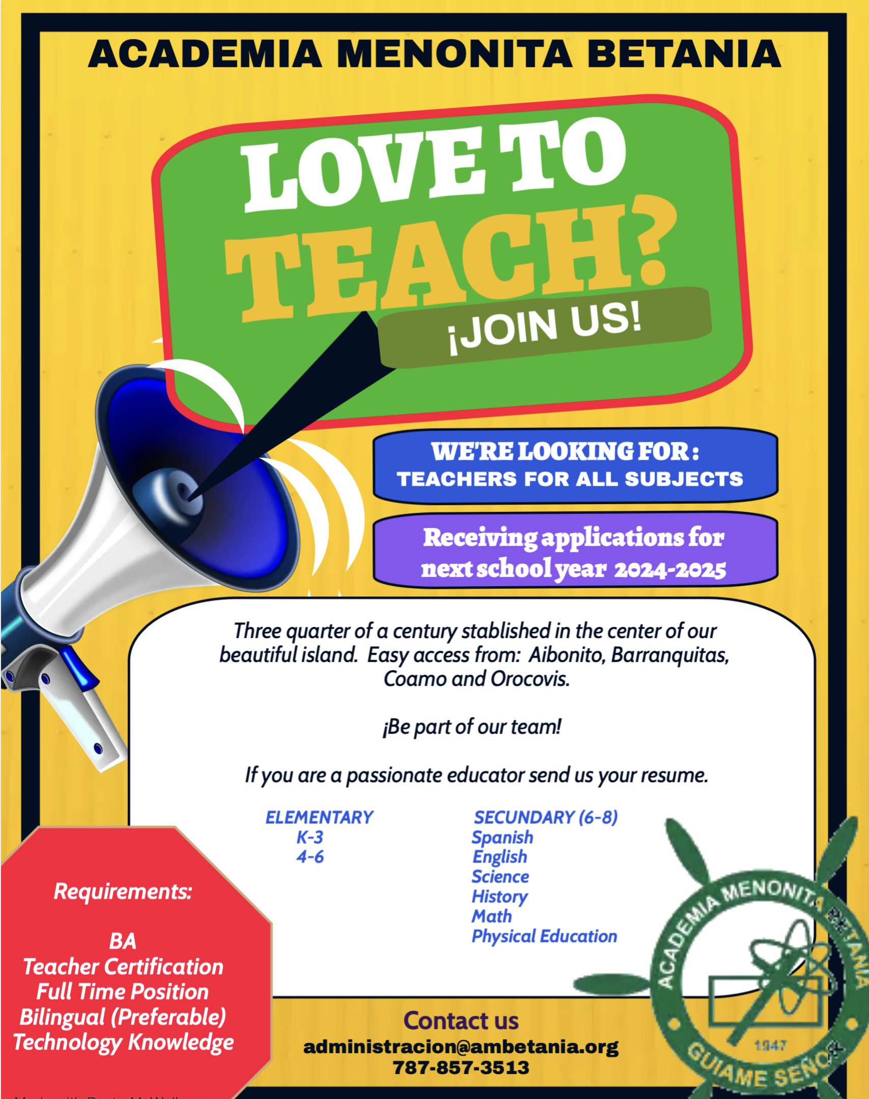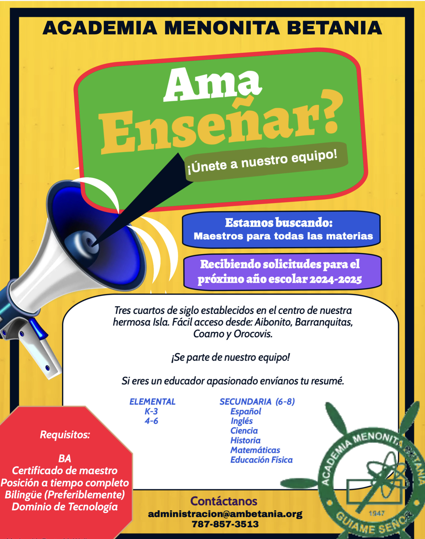 Buscamos maestros para todas las materias que tenga una visión de desarrollo y empoderamiento comunitario para que desempeñe labores de implantación del programa académico de la escuela. Entre las responsabilidades están: Diseñar la enseñanza de los conceptos de acuerdo con el alcance y el nivel de profundidad; Planificar y desarrollar actividades tomando en consideración los estilos de aprendizaje para atender las diferencias individuales; Establecer una comunicación reflexiva con sus compañeros maestros, personal de apoyo, estudiantes, padres o encargados; Mantiene documentación administrativa al día, entrega de planes, asistencia y evaluaciones según sea requerido.