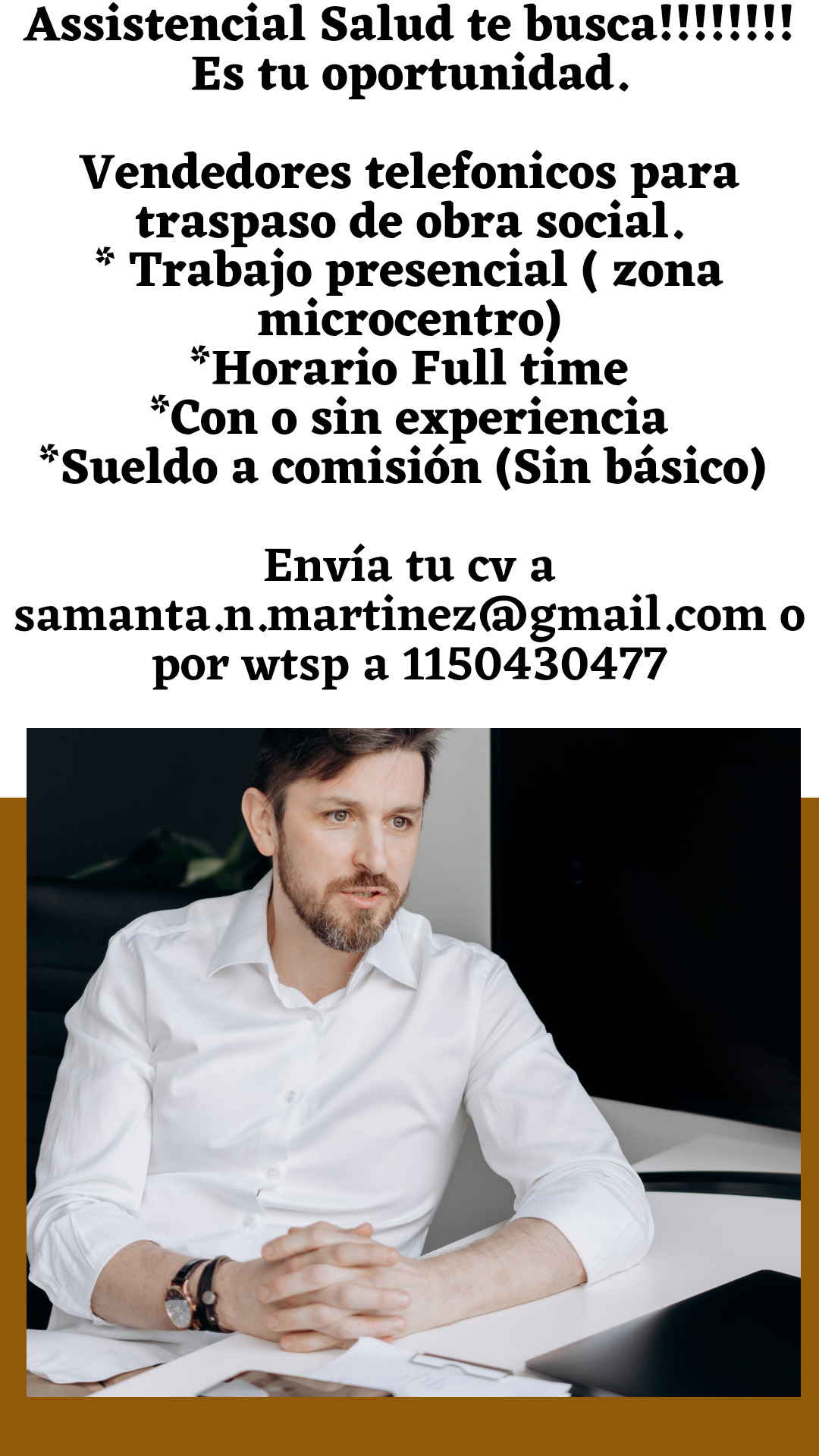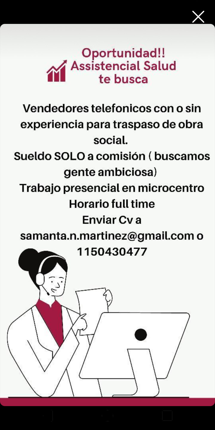 VENDEDORES TELEFONICOS PARA TRASPASO DE OBRA SOCIAL. -TRABAJO PRESENCIAL -HORARIO DE FULL TIME 10 A 18HS -ZONA MICROCENTRO -SUELDO BÁSICO CON PAGO QUINCENAL ENVIAR CV A SAMANTA.N.MARTINEZ@GMAIL.COM O POR WTSP A 1150430477 -SUELDO