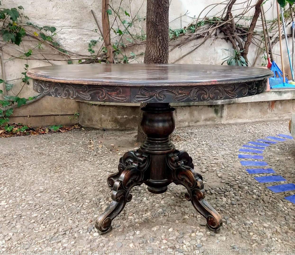 Vendo mesa redonda de comedor con pie central tallado de madera maciza de 1, 30 mts de diámetro con 6 sillas antiguas restauradas. $40.000 estilo ver foto.