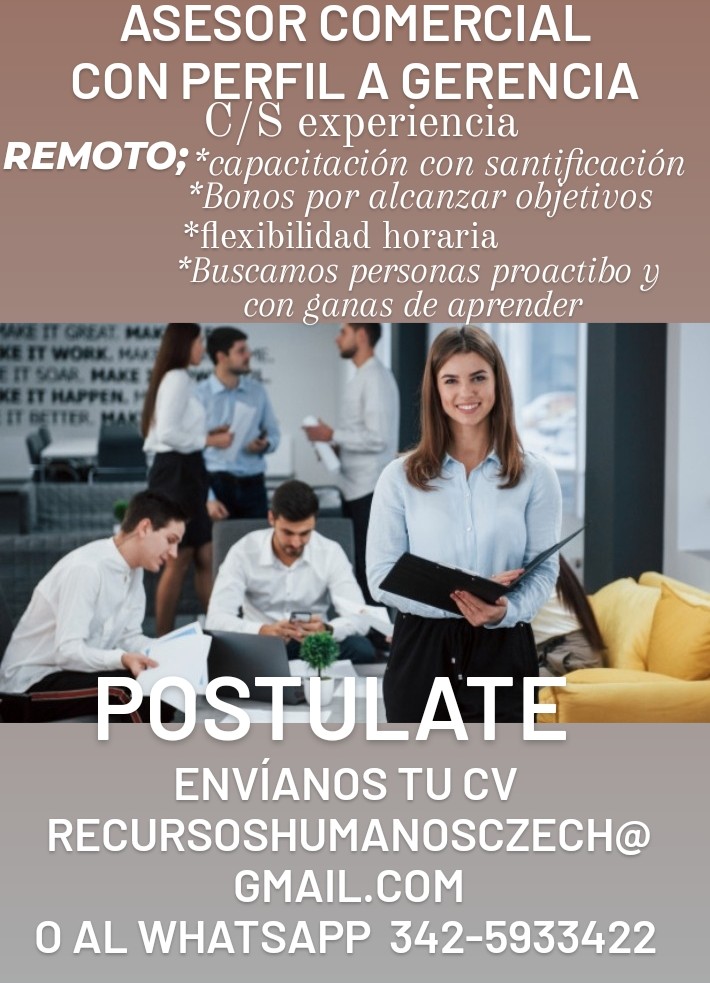 Importante empresa incorpora asesor comercial con perfil a gerencia. Postularse enviar cv recursoshumanosczech@gmail.com o al WhatsApp 342-5933422.