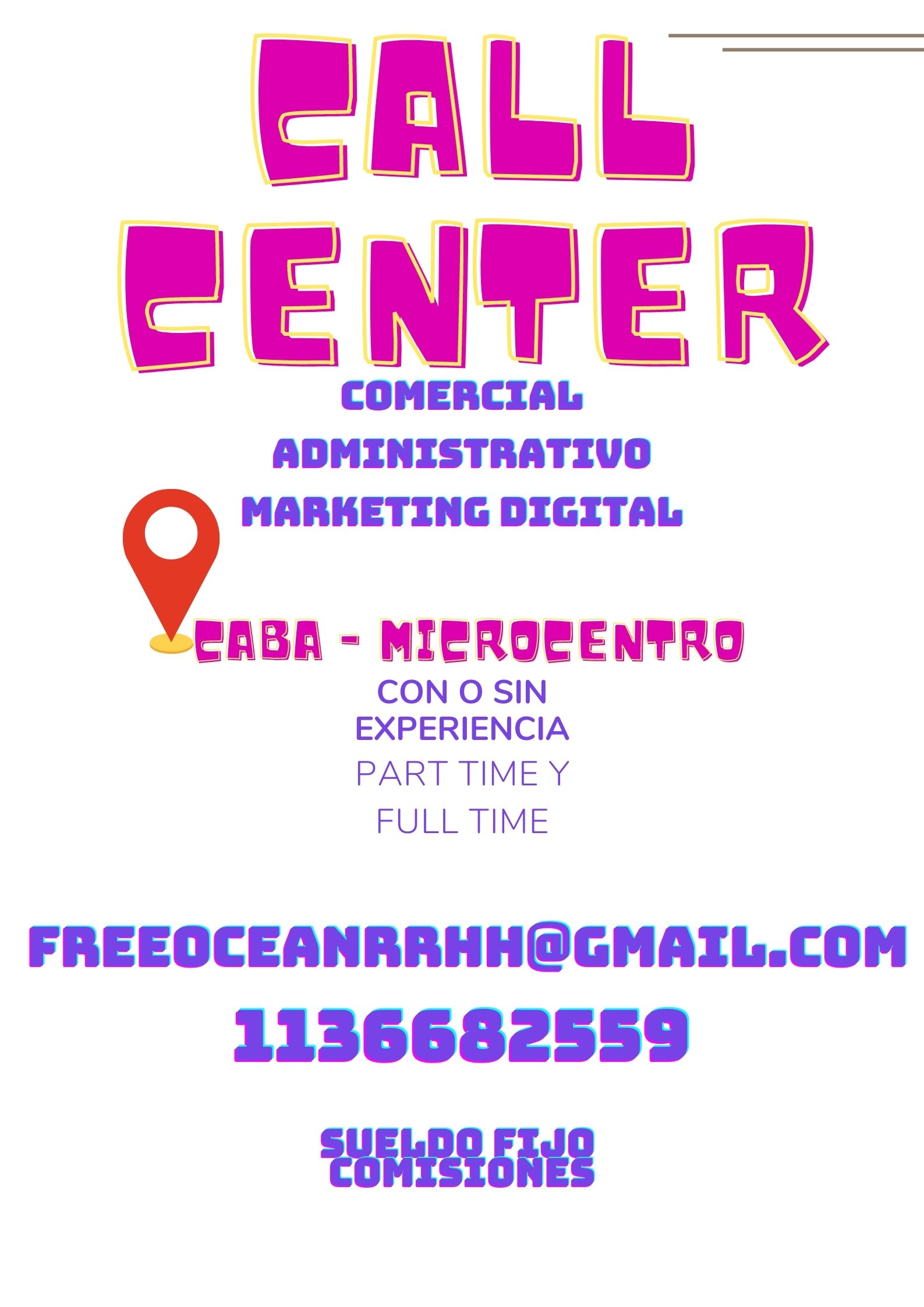 Call Center automotriz ubicado en la zona de Microcentro se encuentra en búsqueda de vendedores con actitud, compromiso y ganas de aprender. Requisitos: - Género: indistinto - Edad: 18 a 30 años - Zona de residencia: CABA o alrededores - Jornada: PART TIME con certificado de alumno regular -Experiencia: CON o SIN EXPERIENCIA ya que la empresa se hace cargo de la capacitación necesaria para que puedas desempeñarte de manera exitosa! -Tipo de empleo: Media jornada Contacto: 1136682559 – Rosario Acosta (escribi o manda CV) freeoceanrrhh@gmail.com