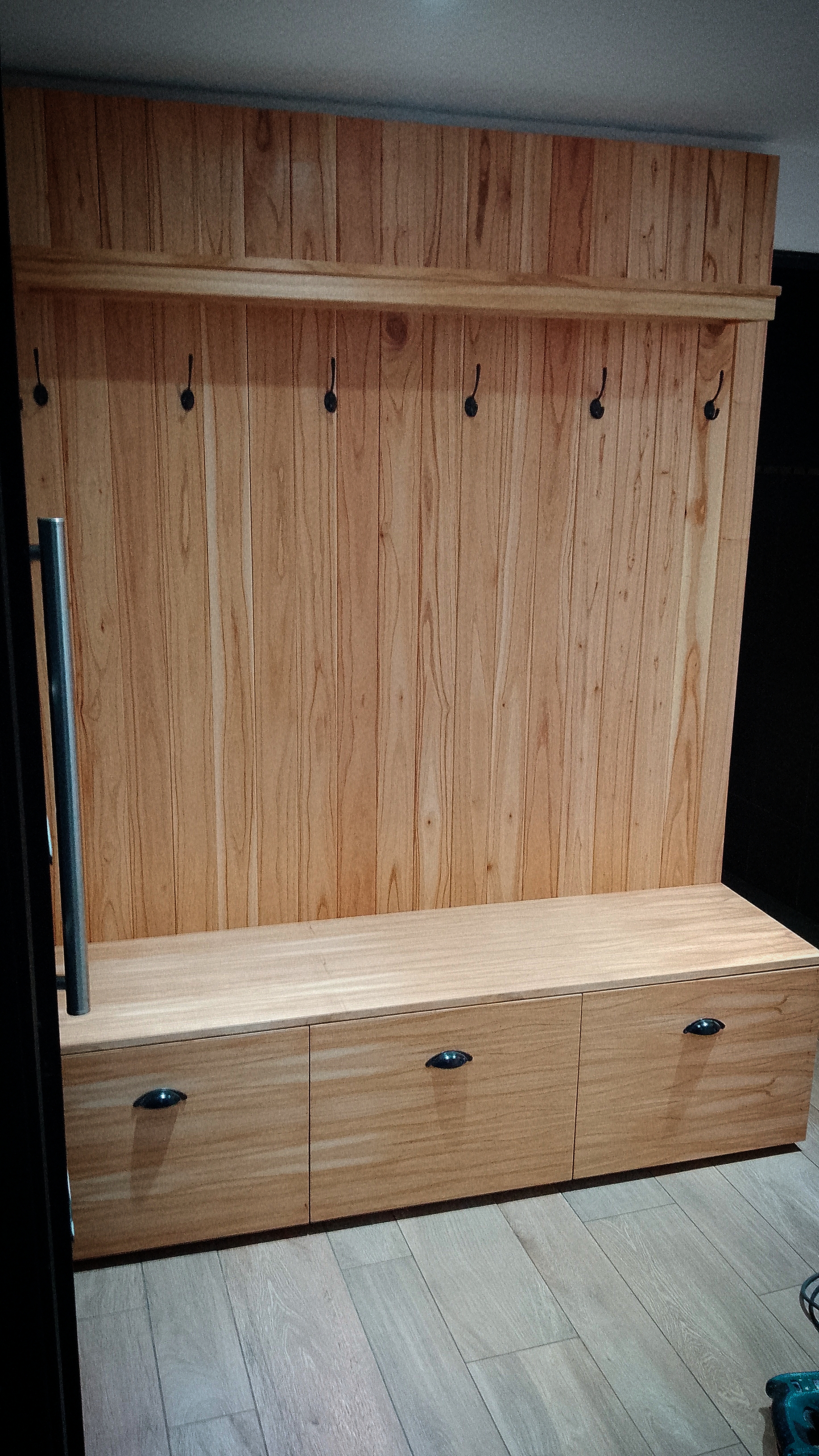 Recibidor de eucalipto, cajones con guías telescópicas reforzadas.