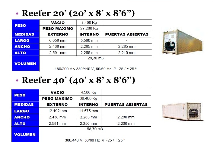 Se encuentran en perfectas condiciones ya que antes de su entrega se le hace un control técnico para su normal funcionamiento. En interior los contenedores son de acero inoxidable, tienen una potencia de 7, 5 Hp y un consumo de 6 Kw/h. Son ideales para almacenar todo tipo de mercadería que requiera frío (lácteos, carnes, frutas, verduras, hielo, etc).