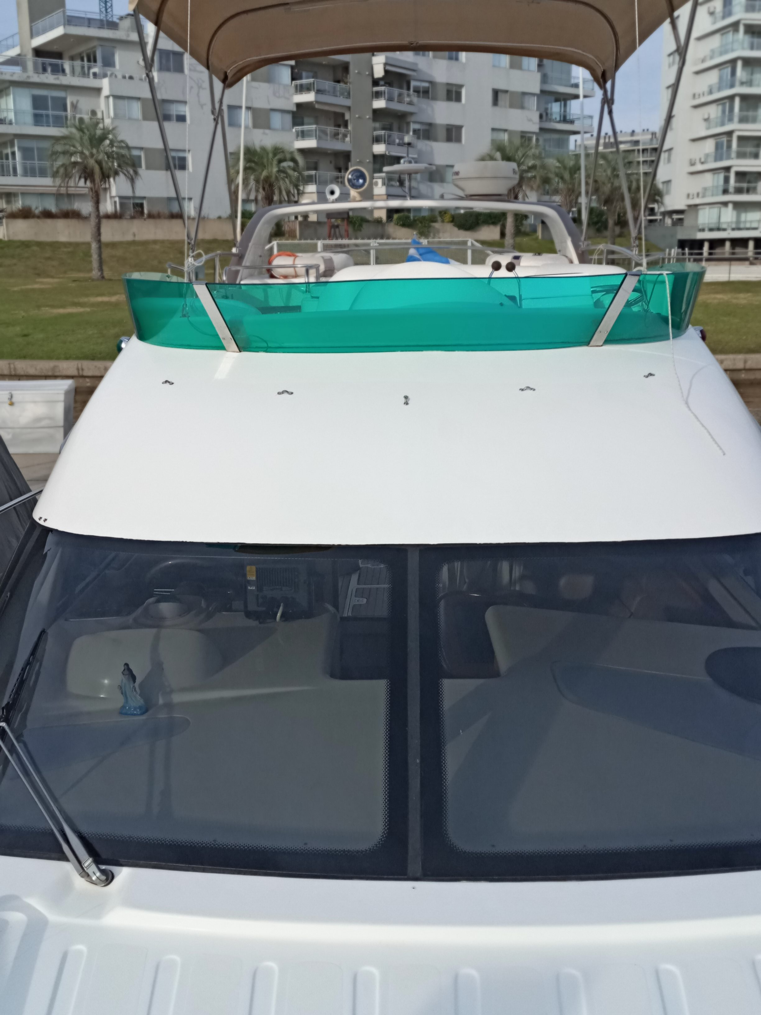 Desplazamiento: 7.000 kg. Velocidad: 29/33 nudos. Un camarote en proa en suite y otro en babor. Salón muy amplio con mesa grande. Su espacioso y funcional interior posee una timonera interna de óptima visibilidad y ergonomía, una dinette con sillón muy confortable para cinco personas con una mesa convertible en una cama doble, cocina ingeniosamente diseñada para que no esté a la vista cuando no se la utiliza. Mesa en el cockpit. Dos motores Cummins de 220 HP. Semituneles que hacen optima su navegación en planeo. Tres baterías de 12 V. y 180 Amp/h.Circuito 220 V. Convertidor 12/220 V. Dos cargadores automáticos inteligentes. Grupo electrógeno de 6 KVA. Dep. Agua: 300 l. Dep. Combustible: 750 l. Inodoro eléctrico. Ducha. Agua fría/caliente a presión. Termotanque. Cuatro hornallas eléctricas. y horno eléctrico. Microondas. Heladera. Freezer. Heladera en popa. Webasto. Aire acondicionado. Dos TV pantalla plana. Equipo de músi