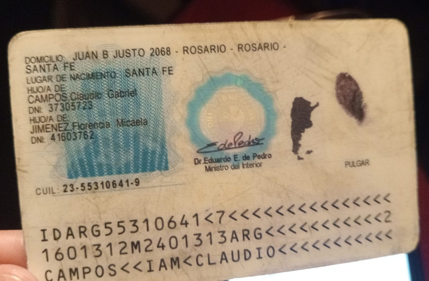 El DNI de Iam Claudio Ocampos (Rosario, 31 de enero de 2016) Fue encontrado en la ciudad de Rosario. DNI: 55.310.641