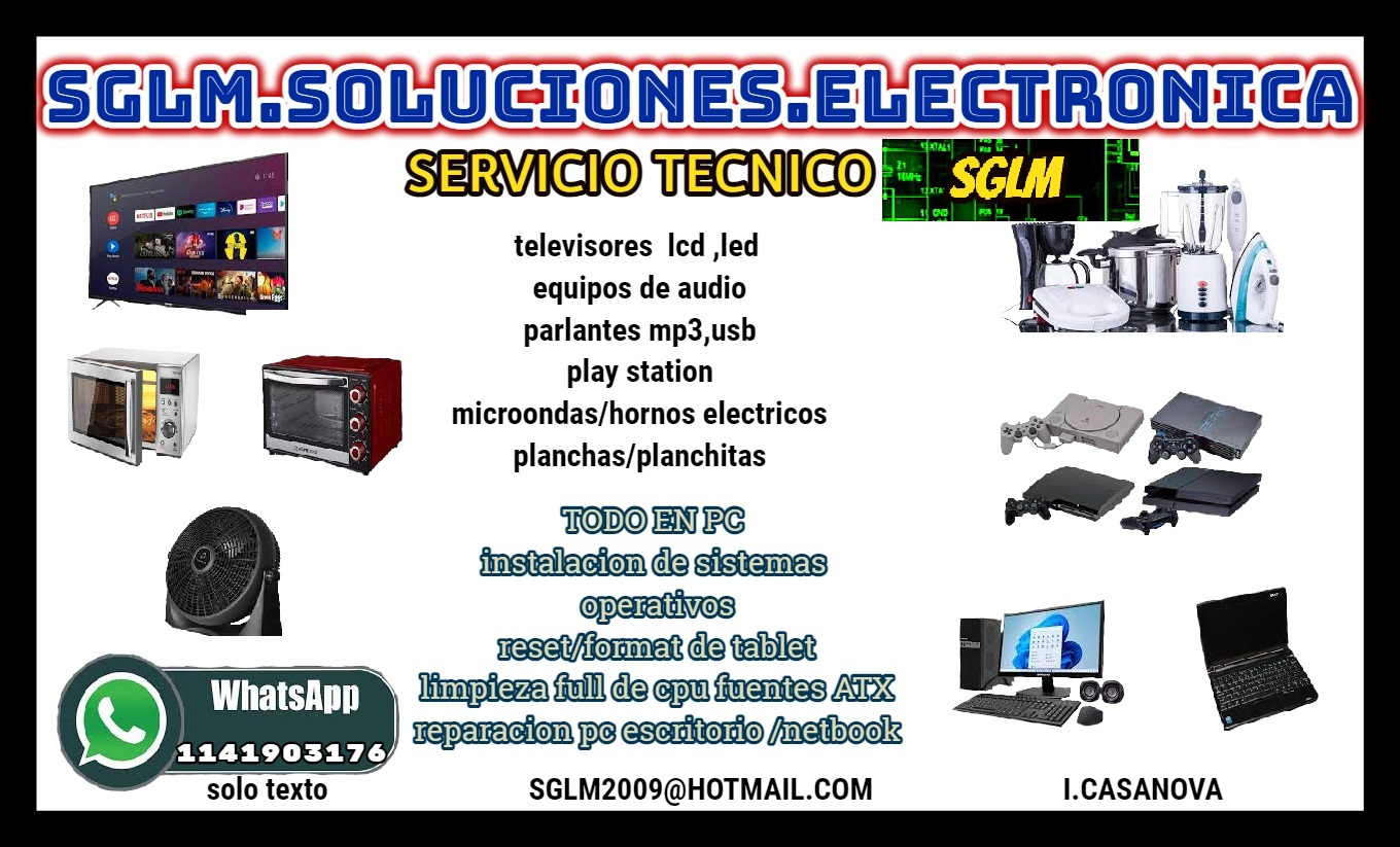 SGLM SOLUCIONES ELECTRONICA somos servicio técnico mas de 36 años de experiencia todo nuestros trabajo son con garantía contamos con seguimiento de la reparación vía Internet el mejor precio