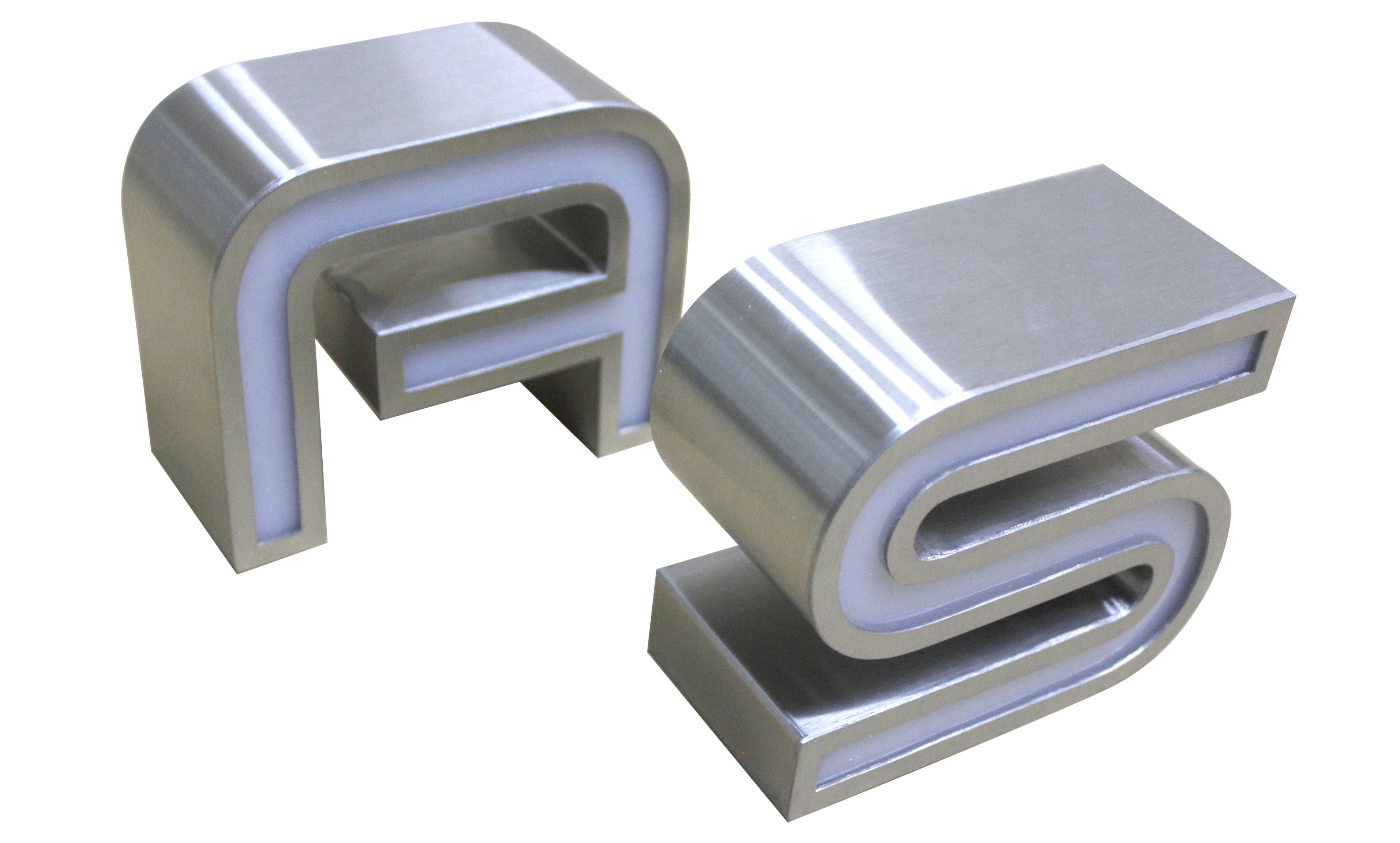 - Letras 3D cajón en acero inoxidable, chapa galvanizada, bronce, acrílico.
