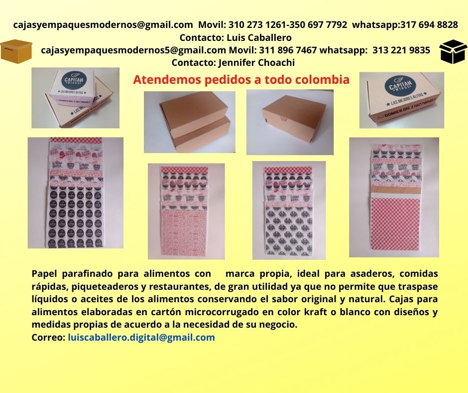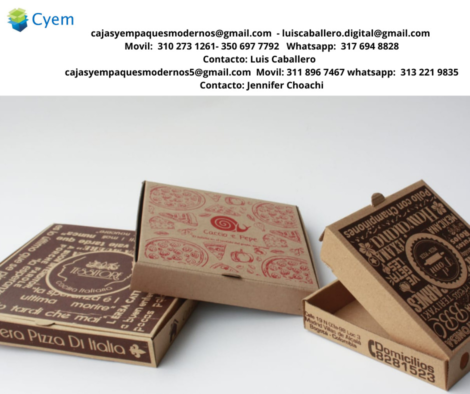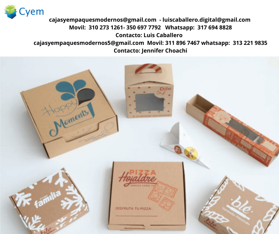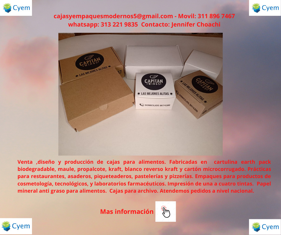 Venta ,diseño y producción de cajas para alimentos. Fabricadas en cartulina earth pack biodegradable, maule, propalcote, kraft, blanco reverso kraft y cartón microcorrugado. Prácticas para restaurantes, asaderos, piqueteaderos, pastelerías y pizzerías. Empaques para productos de cosmetología, tecnológicos, y laboratorios farmacéuticos. Impresión de una a cuatro tintas. Papel mineral anti graso para alimentos. Cajas para archivo. Atendemos pedidos a nivel nacional.