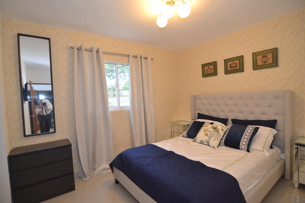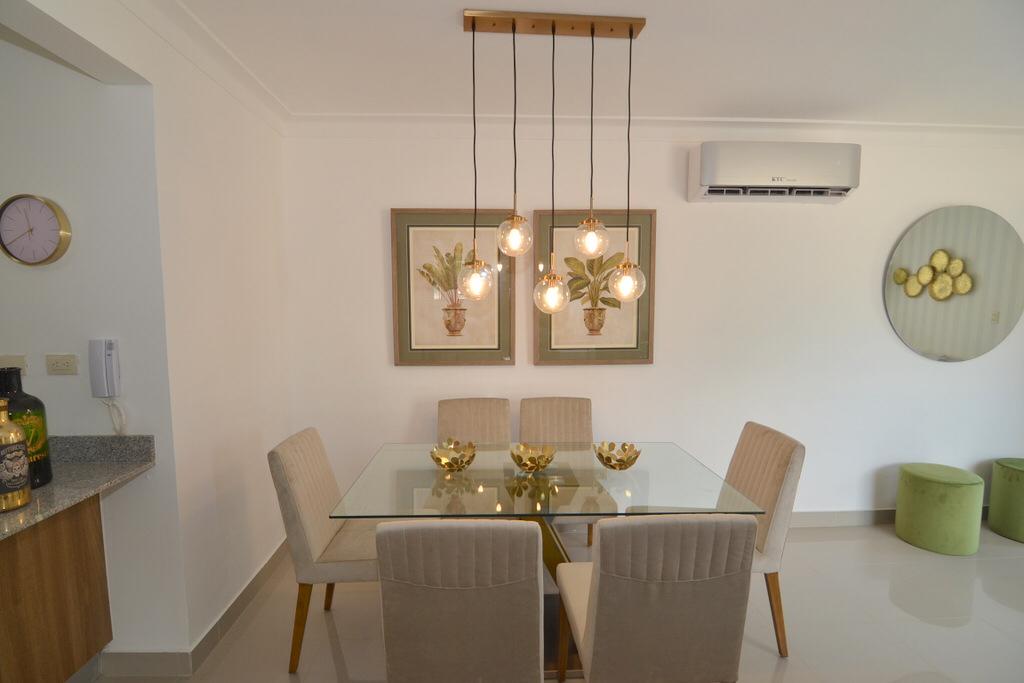 Totalmente amueblado Tres habitaciones la principal con baño propio, las otras dos comparten baño, 2 terrazas, cocina, cuarto de servicio, balcón, Parqueo, gimnasio, piscina, ascensor casa club seguridad 24/7