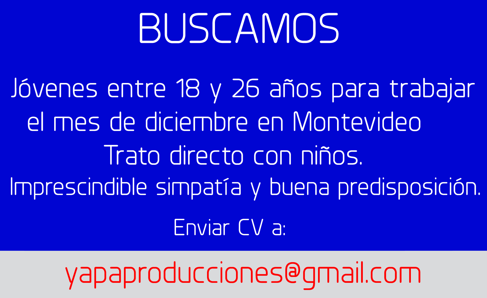 Buscamos jóvenes entre 18 y 26 años para trabajo temporal el mes de diciembre en Montevideo. Trato directo con niños. Imprescindible buena predisposición y simpatía. Interesados enviar CV: yapaproducciones@gmail.com